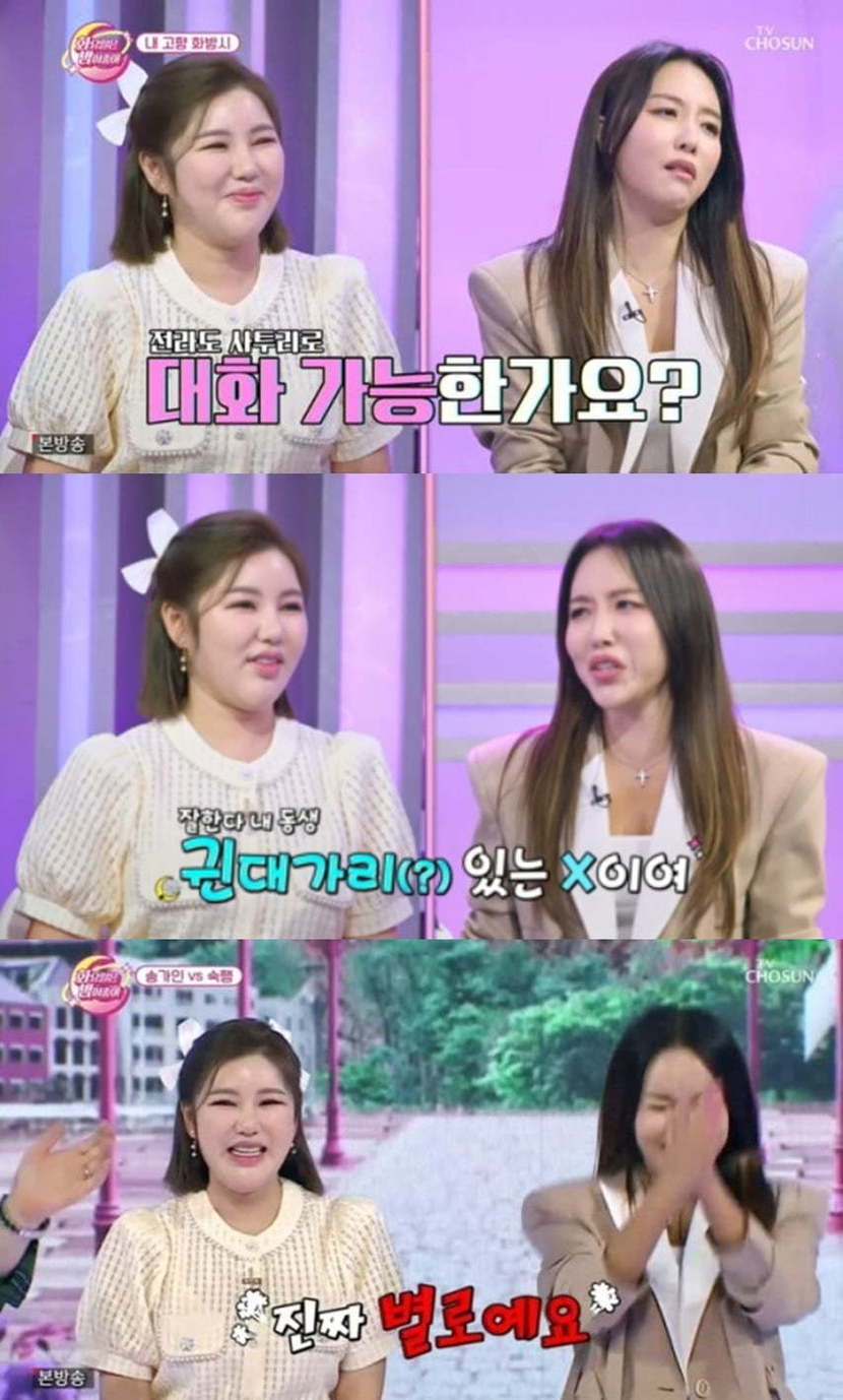 이날 전라도 대표로 등장한 숙행은 "진도는 송가인, 광주와 나주는 내가 책임지고 있다"며 송가인을 견제했고, MC 붐의 요청으로 두 사람은 전라도 사투리 대화를 나눴다. 송가인이 "오늘 '화밤'에 와버렸응께 언니의 카리스마를 제대로 보여주쇼~"라고 말문을 열자, 숙행은 "XX하네"라고 받아쳤다.