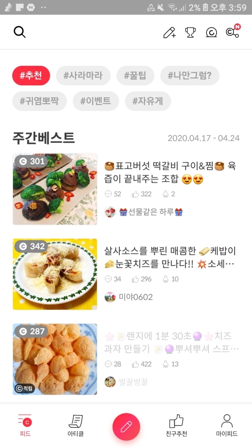 20.04.24 328 읽음 캐시피드 꿀팁 앱테크 꿀팁 저장소 구독하기 0 7 콘텐츠의 수익 36 캐시피드에서는 음식이나 만든음식을 올리면 많이받을 수 있다. 솔직히 오늘의 베스트 글들이 다 그렇다. 그러니 요리글을 올리도록 하자. 7 0 / 300 입력