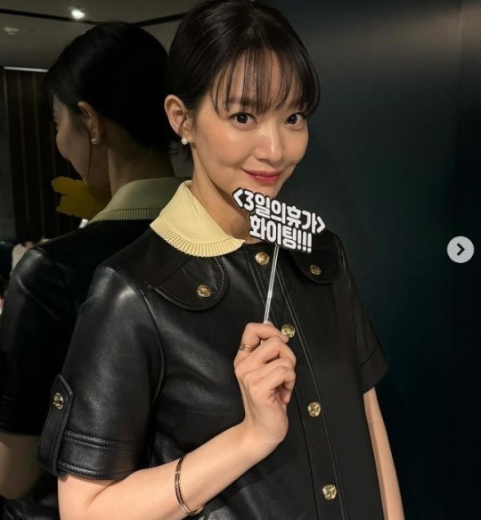 사진 속 신민아는 '3일의 휴가'라고 적힌 막대를 들고 포즈를 취하고 있다. 신민아는 보조개 미소를 지으며 귀여움을 자아낸다.