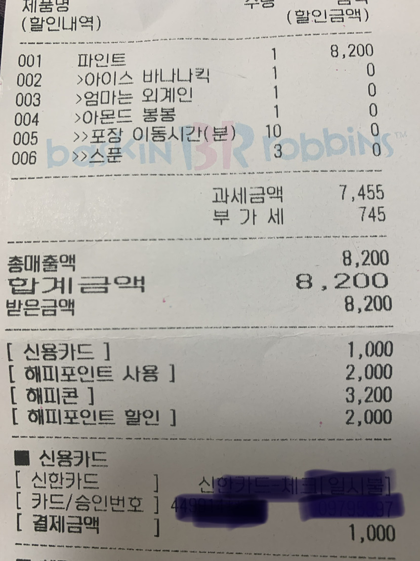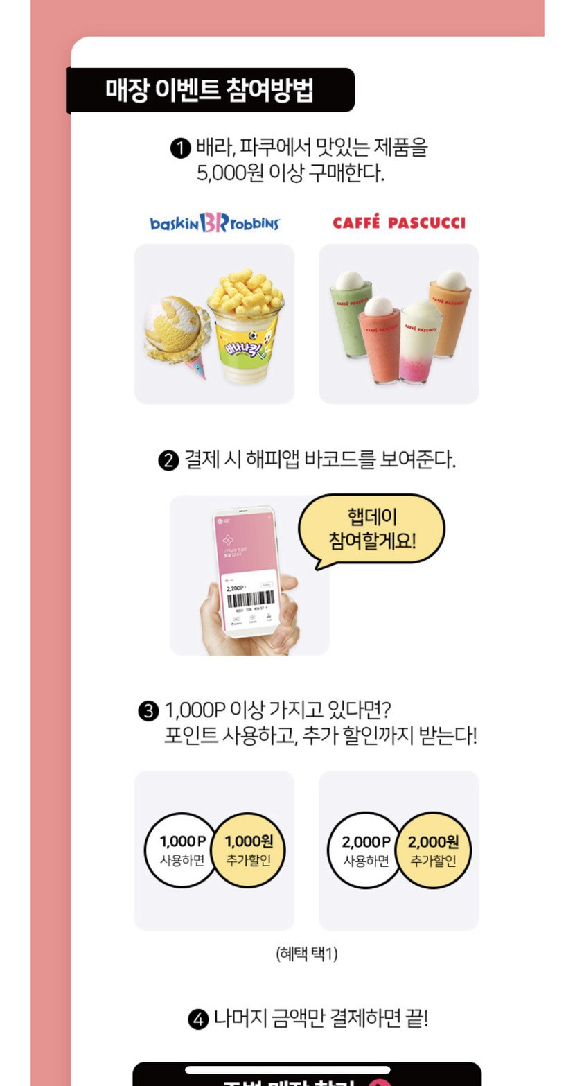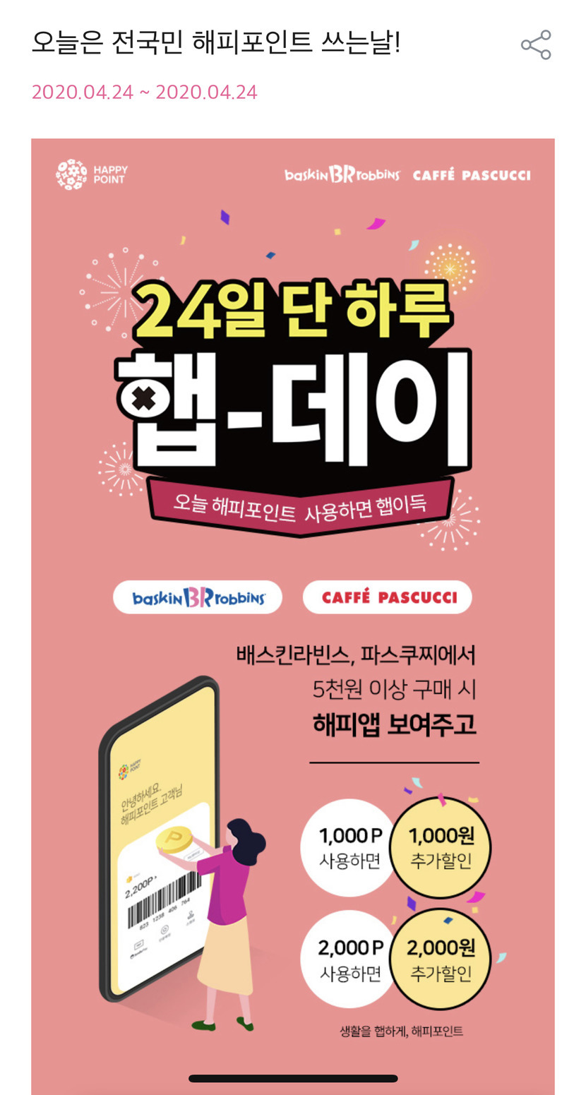 무튼. 햅데이는 파스쿠찌와 배스킨라빈스에서 오늘만 된다고 합니다. 단 5천원 이상 구매시에 적용
