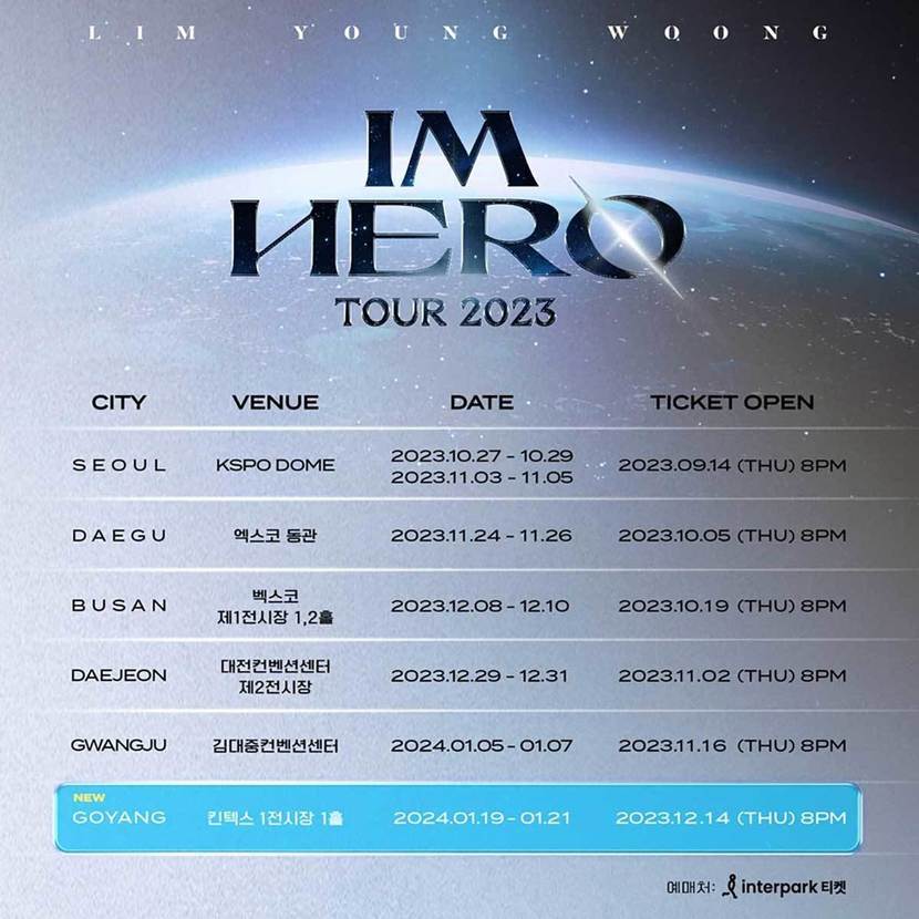 위키트리임영웅 고양콘서트는 전석 매진 행렬을 이어가고 있는 임영웅이 더 많은 팬들과 만나 소중한 추억을 쌓기 위해 추가로 오픈했다. 14일 오후 8시 2023 임영웅 전국투어 콘서트 ‘IM HERO’(아임 히어로) 고양 티켓 예매가 인터파크 티켓을 통해 시작된다.