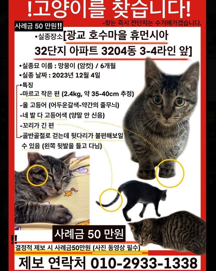 23.12.14 497 읽음 수원 광교 인근! ! ! 망뭉이 찾아요 애옹이맘 구독하기 27 45 콘텐츠의 수익 7 혹시 수원사시는 분 계실까 또 올려봅니다.아이 같이 수색해주실 분도 전단지 내 번호로 연락부탁드리겠습니다ㅠㅠ답글 안남겨줘도 되세요~! 45 0 / 300 입력