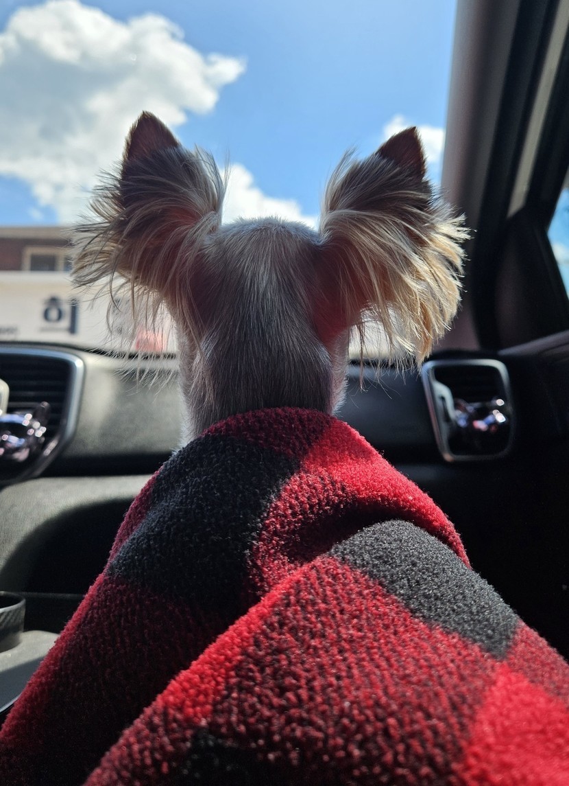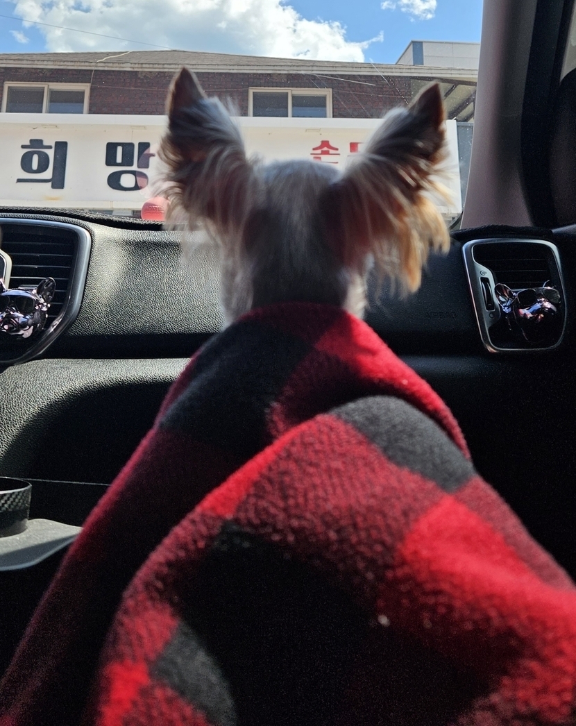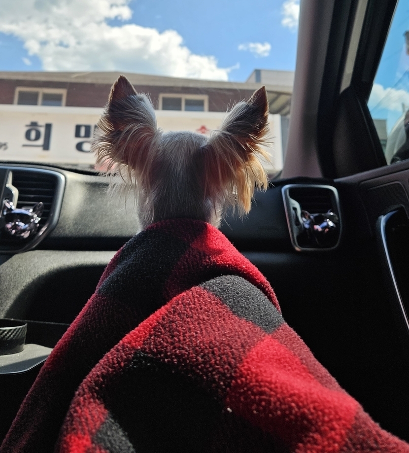 담요 덮고 풍경보는 강아지