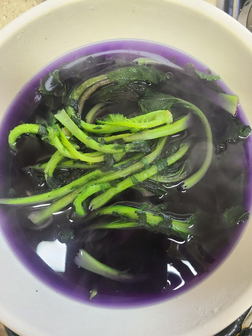 갓채소를 데쳤더니 이렇게 예쁜 보라색이