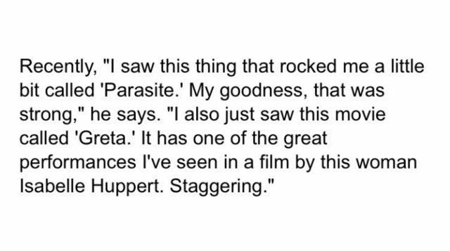 19.11.06 486 읽음 알 파치노가 기생충 언급 타노스페이스 구독하기 0 0 콘텐츠의 수익 0 USA TODAY 인터뷰 중 요즘 빠져있는것으로기생충, 마담 싸이코, 이자벨 위페르를 뽑음 0 0 / 300 입력