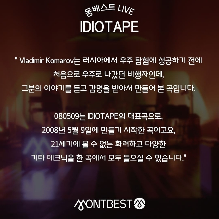 독창적인 멜로디와 깊이를 보여주는 대한민국 일렉트로니카 밴드 IDIOTAPE과 몽베스트가 만났습니다!