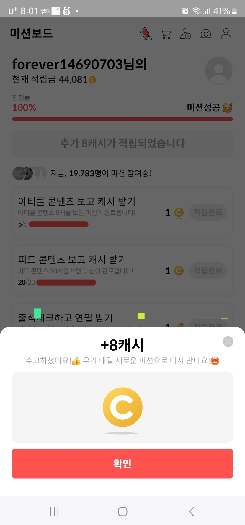 오랜만에 8캐시 받았어용~