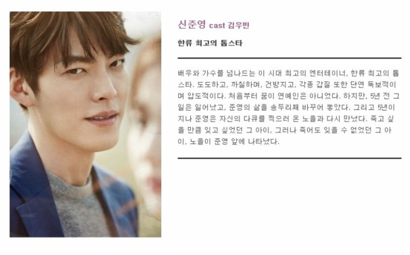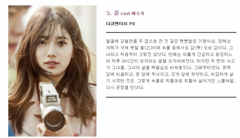 고등학교때 슬픔 악연으로 해어진 두 남녀가 8년뒤 기자와 시한부인생 톱스타로 다시만나서 벌어지는 슬픈 사랑 이야기 인데요 8년전 노을(수지)는 신준영(김우빈) 때문에 큰 교통사고를 당해 죽을뻔 했는데 이때 신준영(김우빈)이 ‘신이있다면 을이를 살려주십시오 을이를 살려준다면 내게 있는 모든 행복을 기꺼이 내놓겠습니다 을이를 살려준다면 내게 남은 모든 삶을 모두 내놓겠습니다’ 라고 했는데요 그래서 을이와 신준영이 8년만에 재회하고 둘은 사랑하게 됩니다 하지만 신준영은 자신의 아버지 때문에 노을 아버지가 당한사고의 진실을 밝혀내고자 하는 스토리 입니다 정말 이드라마는 너무너무 슬프고 감동적인 드라마입니다 꼭 한번 보시길 추천 드려요