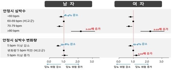반면 안정시 심박수가 5bpm 이상 증가한 경우 여자는 당뇨 위험이 약 1.2배 증가하는 것으로 나타났고, 남자는 뚜렷한 변화가 없었다. 이렇게 남녀 간 서로 다른 양상을 확인한 것은 이번 연구가 최초라는 게 국립보건연구원의 설명이다.