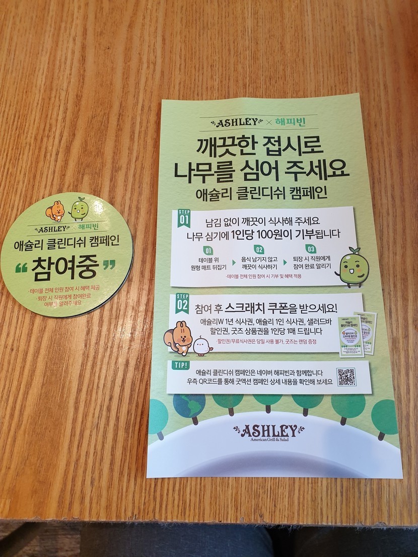 20.05.05 341 읽음 애슐리 해피빈 클린디쉬 이벤트 참여 뜅뜅뚱이 구독하기 15 24 콘텐츠의 수익 39 애슐리X해피빈 클린디쉬 이벤트 참여 했네요.음식을 남기지 않으면 1명당 나무심는곳에 100원씩기부하는 이벤트입니다.스크래치 쿠폰도 줘서 다음에 애슐리 갈때 이용할수 있네요 24 0 / 300 입력