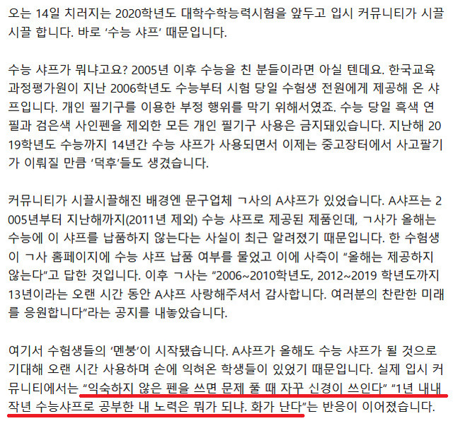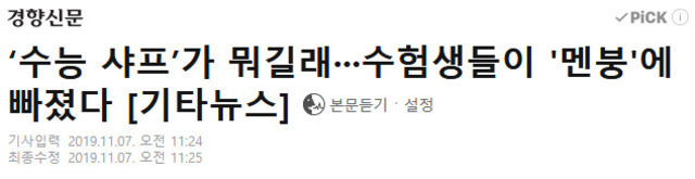 19.11.07 96 읽음 수능 샤프가 뭐길래···수험생들이 '멘붕'에 빠졌다 예쁜남자 구독하기 0 0 콘텐츠의 수익 0 https://n.news.naver.com/article/032/0002973327 0 0 / 300 입력