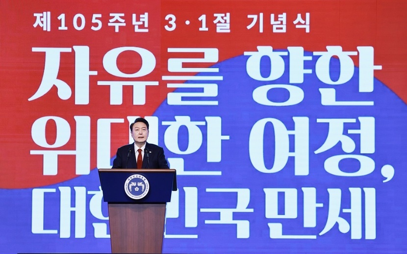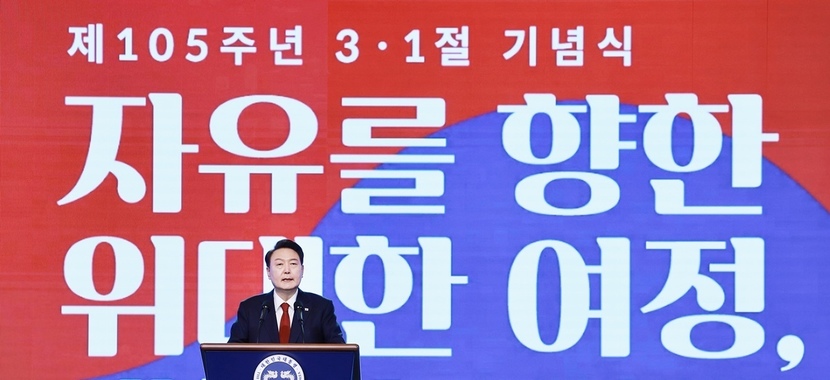 윤 대통령이 삼일절 기념사를 한 연단 뒤에는 '자유를 향한 위대한 여정, 대한민국 만세'라는 기념식 주제가 적혀 있었다.