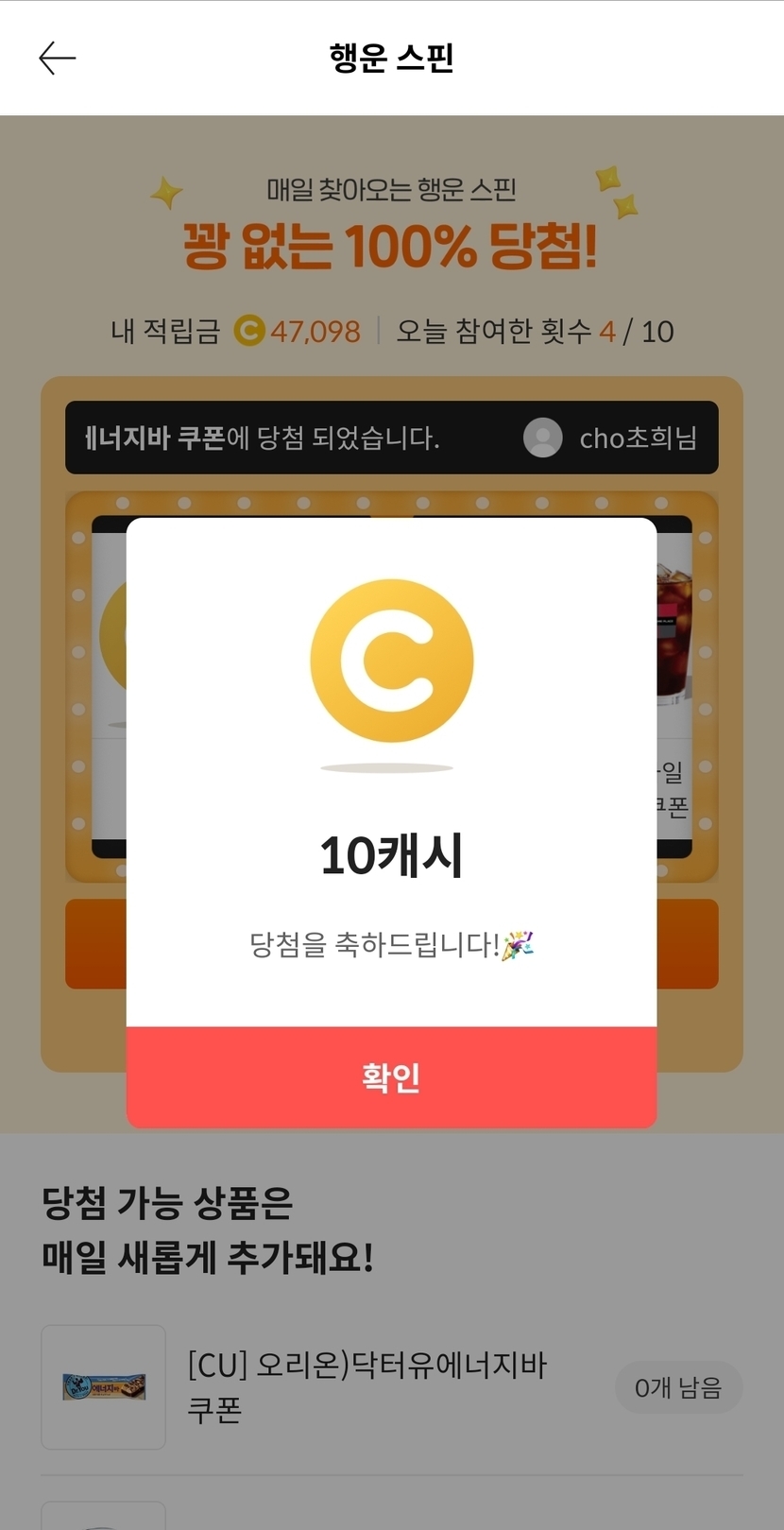 10캐시 첨 받았어요