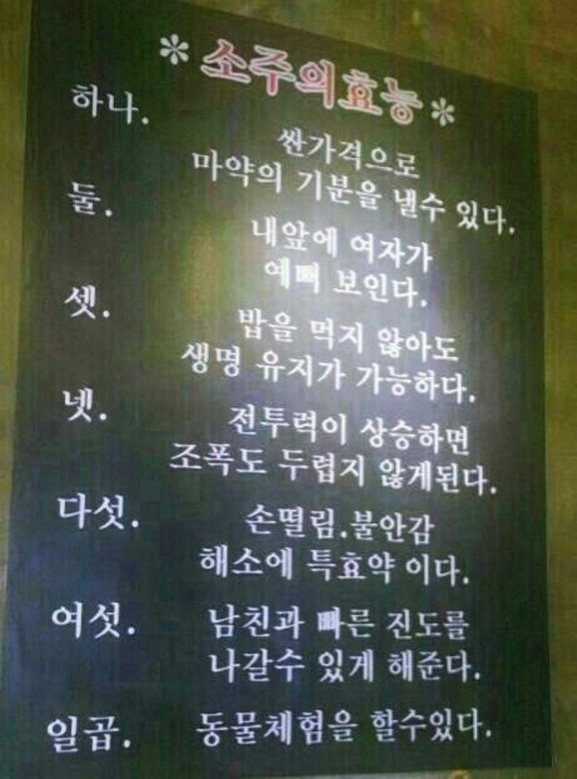 친구랑 술한잔하러갔더니 소주의효능을 상세히 적어놨네,,,쩝..