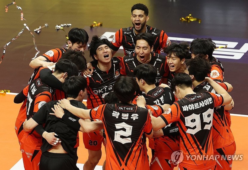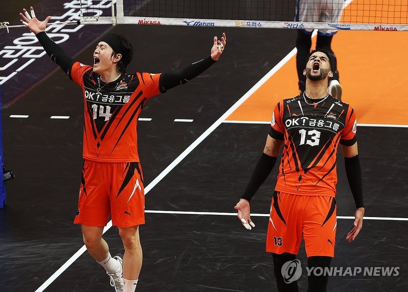 OK금융그룹은 매치 포인트에서 허수봉의 오픈 공격을 레오가 걷어내자 세터 곽명우가 볼을 왼쪽으로 올렸고, 신호진이 왼팔로 큰 스윙을 그리며 터치 아웃 득점을 내 혈투에 마침표를 찍었다.