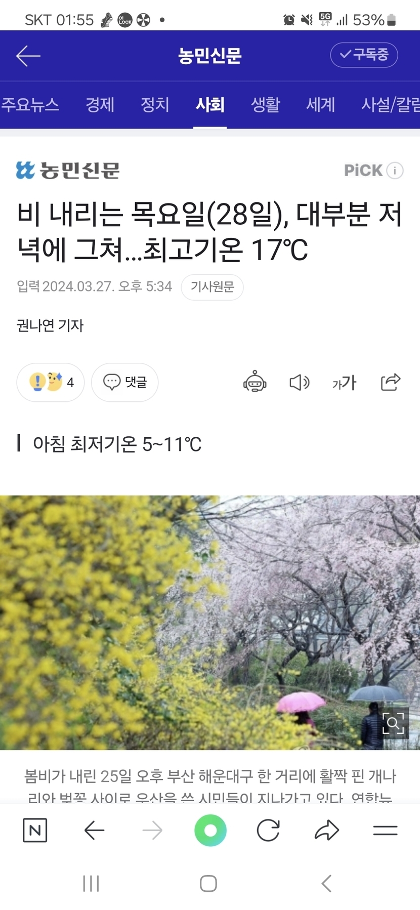 비 내리는 목요일(28일), 대부분 저녁에 그쳐…최고기온 17℃