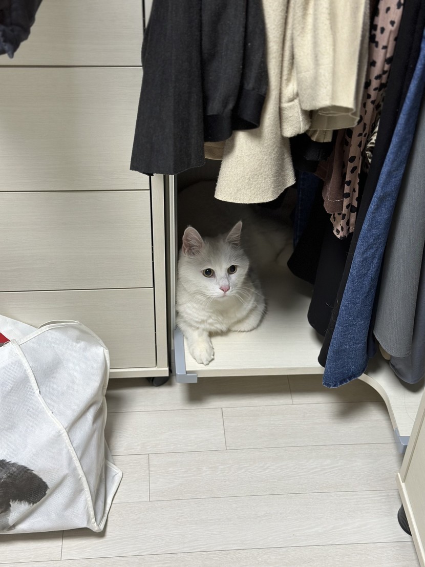 코코가 놀래서 긴장해가지고 숨어버렸어요