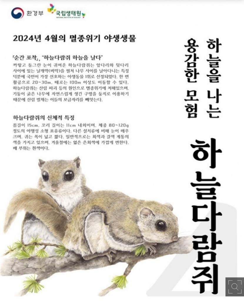 24.04.18 46 읽음 하늘다람쥐 도수사랑 구독하기 0 0 콘텐츠의 수익 1 청설모계열의 하늘다람쥐는 4월 환경부에서 지정한 이달의 멸종 위기 야생동물입니다. 0 0 / 300 입력