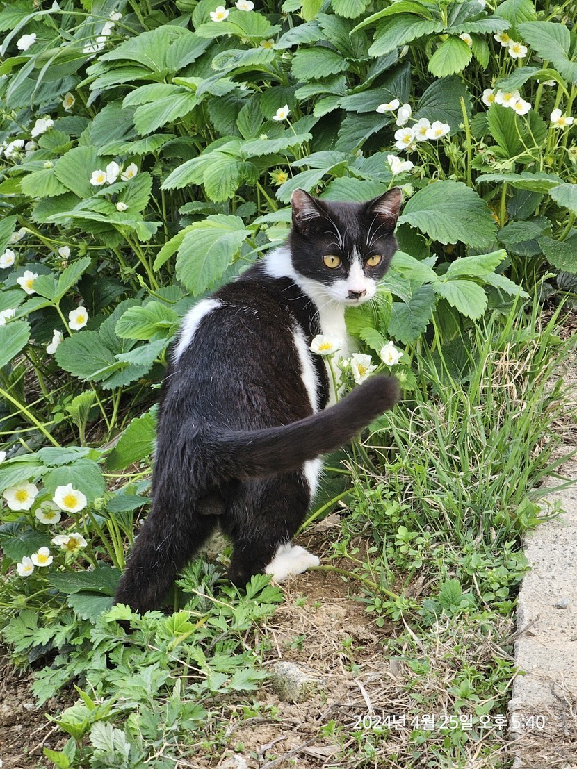 찰리🐯는 지금 마당에 핀 딸기꽃🍓 홀릭❤️