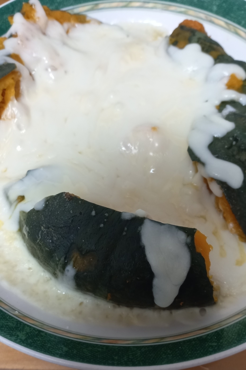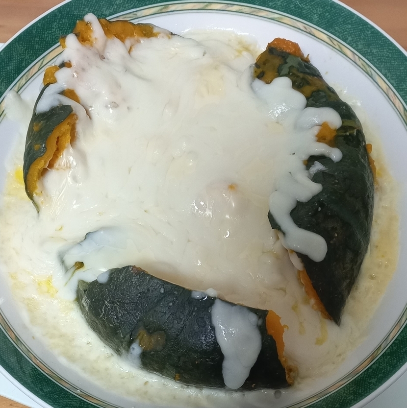 4. 모짜렐라 치즈로 단호박을 채운 다음, 전자렌지용 그릇에 단호박을 넣어 치즈가 녹을 때까지 돌려주면 완성!