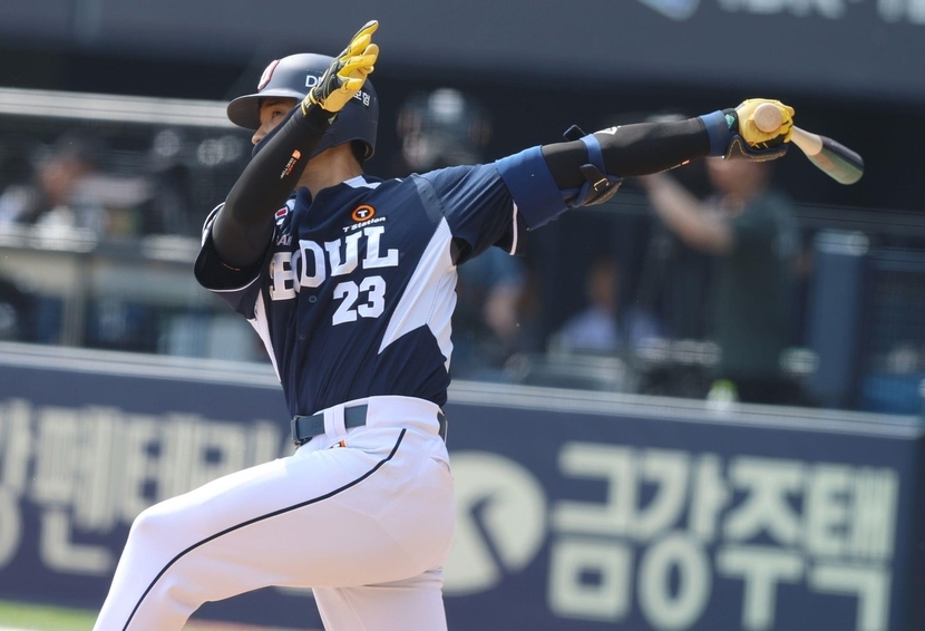 1사 2루에서 타석에 선 두산 3번 타자 강승호는 LG 선발 손주영의 슬라이더를 공략해 왼쪽 펜스를 넘겼다.
