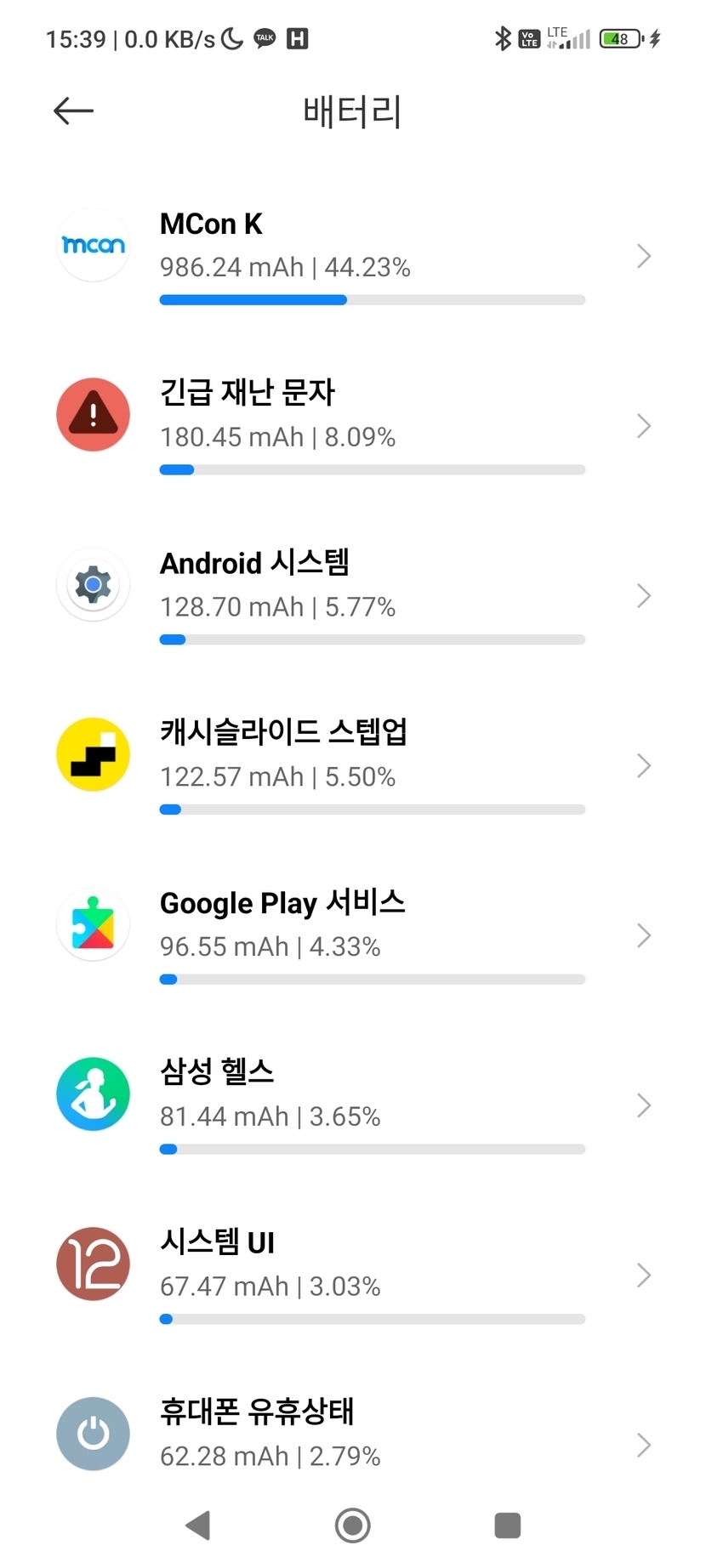 거의 50%나 소모하네요. 어쩐지 배터리가 빨리 떨어지더라니...