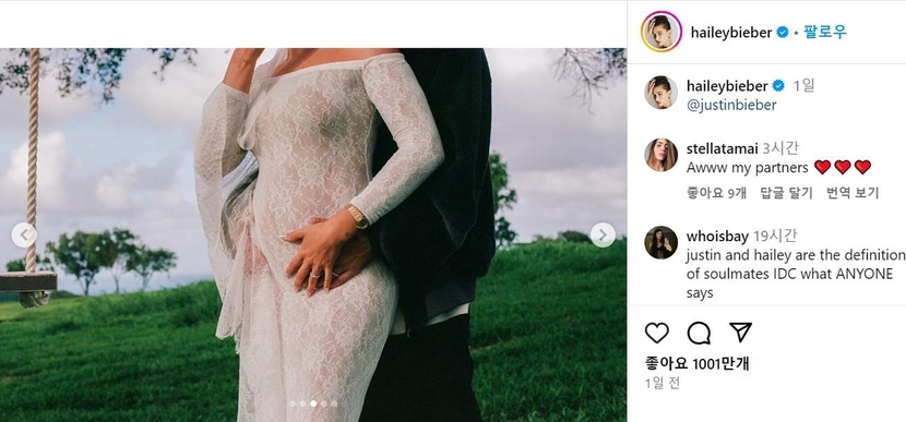 비버 부부는 전날 인스타그램에 헤일리의 임신한 모습을 찍은 사진을 올리며 이 소식을 알렸다.