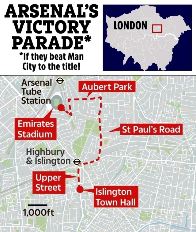 아스널의 우승 퍼레이드 경로를 확정했다는 것인데 아직 우승이 미정인 아스널이지만 이는 어쩔수 없는 행정상 절차 때문이다. 시의회에 미리 교통 통제를 신청해야하고 승인을 받아야하기 때문에 미리 ‘우승 퍼레이드 계획’을 짜놓아야했다.