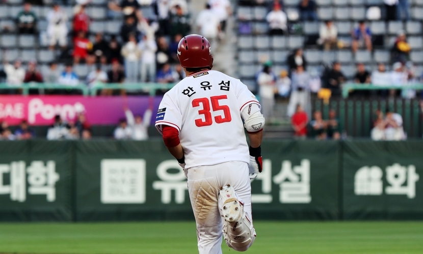 한유섬은 2사 1루에서 원태인의 2구째 시속 127㎞ 체인지업을 걷어 올려, 담 밖으로 공을 보냈다.