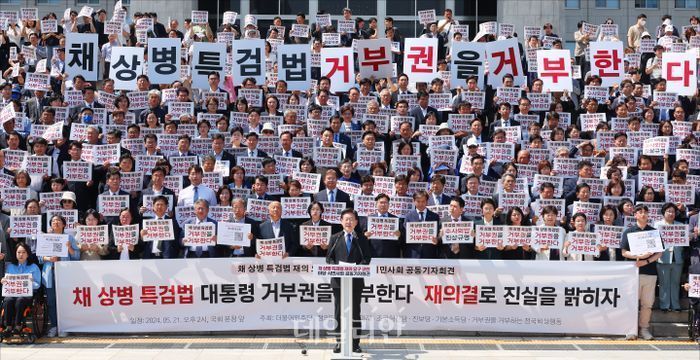 민주당과 조국혁신당, 진보당 등 범야권 및 시민단체는 이날 오후 3시 서울역 광장에서 '채상병 특검법 거부 규탄·통과 촉구 범국민대회'를 연다. 이재명 민주당 대표는 전날 페이스북에 "무도한 정권에 책임을 묻고 해병대원 특검법을 반드시 통과시키기 위해 주권자의 힘을 보여달라"고 참여를 독려했다.