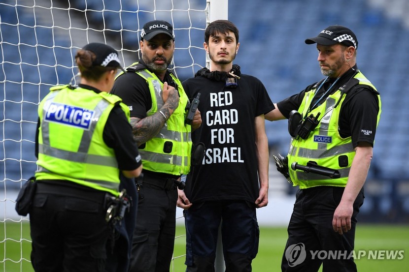 스코틀랜드축구협회가 안전을 고려해 무관중으로 개최한 이날 경기의 킥오프에 앞서 '이스라엘에 레드카드'라는 문구가 적힌 옷을 입은 한 남성이 골대에 자기 목을 자물쇠로 묶고 버티는 시위를 벌였다.