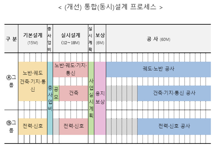 통합(동시)설계 프로세스는 그간 노반·궤도·건축·시스템 등 각 분야별로 분리해 설계해온 기존 방식에서 철도의 모든 분야를 그룹별로 통합해 설계하는 방식이다.