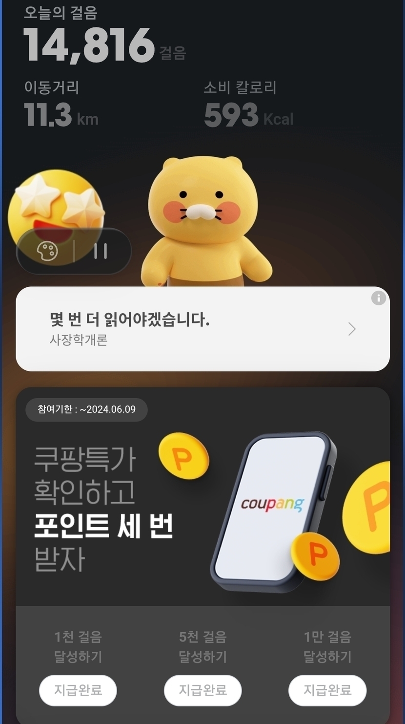 24.06.06 164 읽음 240606 오늘하루 36층 지구별나그네 구독하기 1 2 콘텐츠의 수익 1 백수로 인생을 즐기며 사는데, 어쩌다보니 만보기만 5개? ^^;; 근데 카카오페이만 숫자가 이상하게 튀네요 -.-ㅋ 하루에 인증샷을 올려봅니다~ 혹시나 퀴즈나 인증샷도 도움되는게 있음 좋겠네요 ^^ 당분간은 댓글 남겨주시면 2캐시 씩은 상부상조 갑니다~ ^^ * 캐시피드, 캐시슬라이드스텝업, 발로소득, 비트버니, 카카오페이. 등등?끝에는 공원 걷는데 야자수에 야자를 털고 있더라구요 ㅎㅎ 2 0 / 300 입력