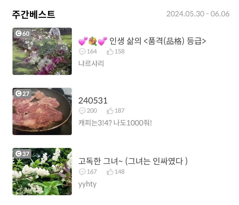 24.06.07 787 읽음 240606 캐피는3!4? 구독!!땡큐요! 구독하기 188 184 콘텐츠의 수익 22 척아이롤쿠폰와서 축구보면서 치킨먹을라다가동생있어서 나눠먹음부대찌개먹길래 한그릇만주간베스트 감사합니다 110원30원 왜 또 없노일하라!!!!캐슬놈들아오늘도 웃는 좋은하루되세요 축구보셨나용ㅎ 184 0 / 300 입력