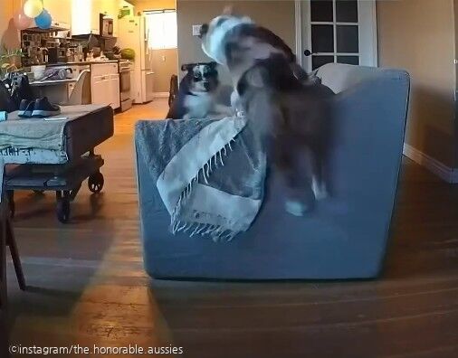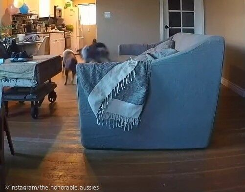 지속된 개들의 놀이에 결국 소파는 원래 자리에서 한참 뒤 구석으로 밀려나게 됐다. 마침내 범인이 밝혀지는 순간이었다.
