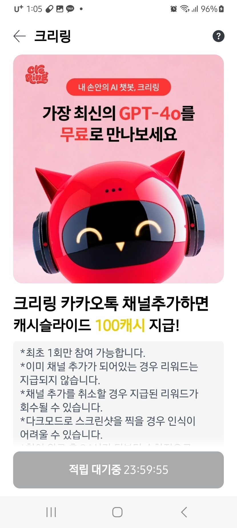 크리링 카톡채널 추가 24시간후 100캐시
