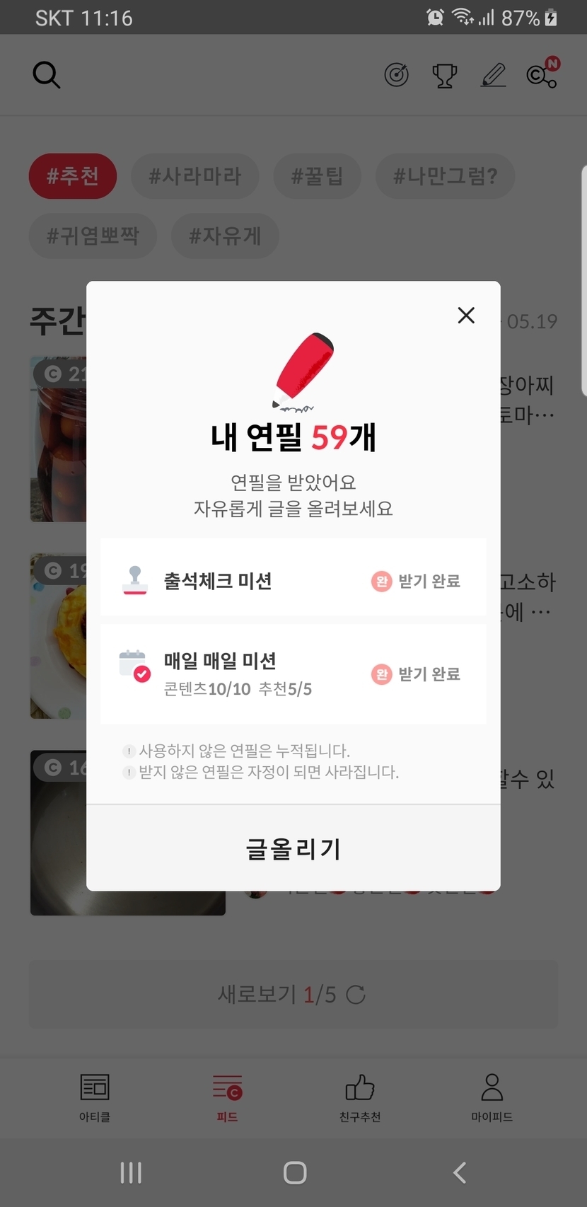 20.05.19 477 읽음 ✏✏✏연필은 쌓이고 콕은 너무 순식간에 종료되고ㅋㅋ🤣🤣 leesj0104 구독하기 9 24 콘텐츠의 수익 24 수익이 적으니 글도 안쓰게 되고..콕하려니 구독자수 많으신분들은 뜨자마자 종료ㅋㅋ 아오~~~🤣🤣의도치않게 연필만 쌓이네요이러다 100개찍을듯💯💯💯💯💯근데 요즘 알림이 잘안뜨네요뜨는 속도두 느리고..ㅋ 오류인가;;;; 미련을 못버리고 하고는 있지만....열심히 글쓰고 사진작업해서 올리시는분들은 참 허무할듯해요..수익금이 너무..ㅜㅜ 24 0 / 300 입력