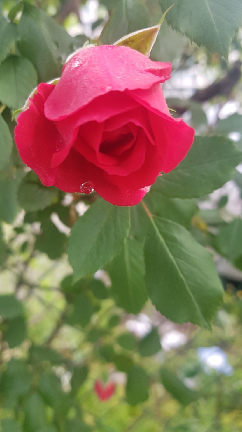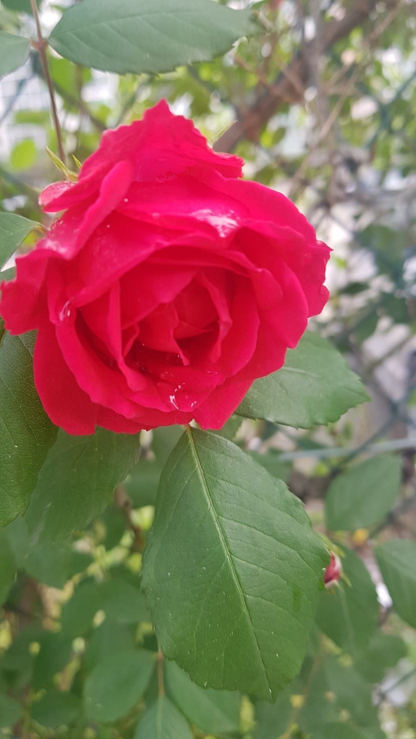 가로수 사이에 피어난 장미꽃