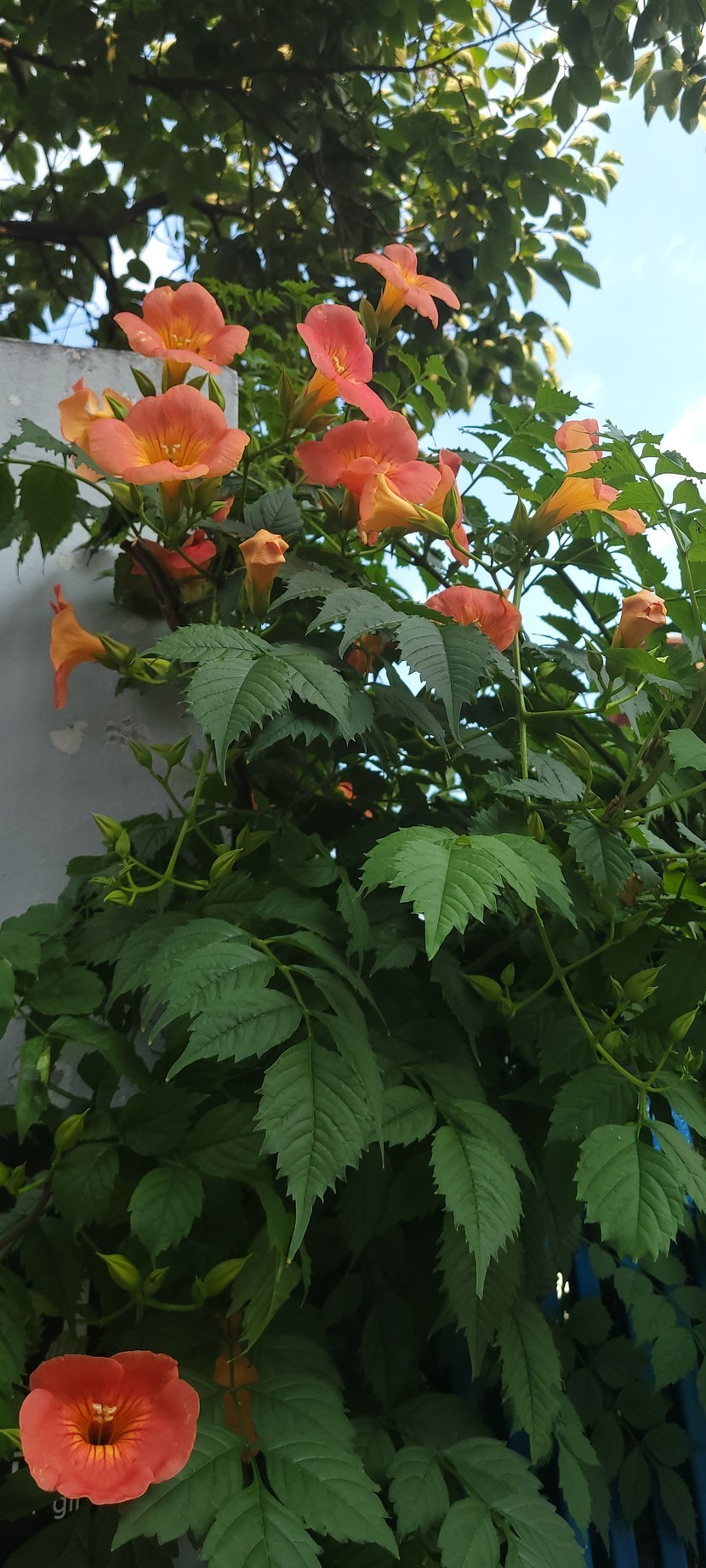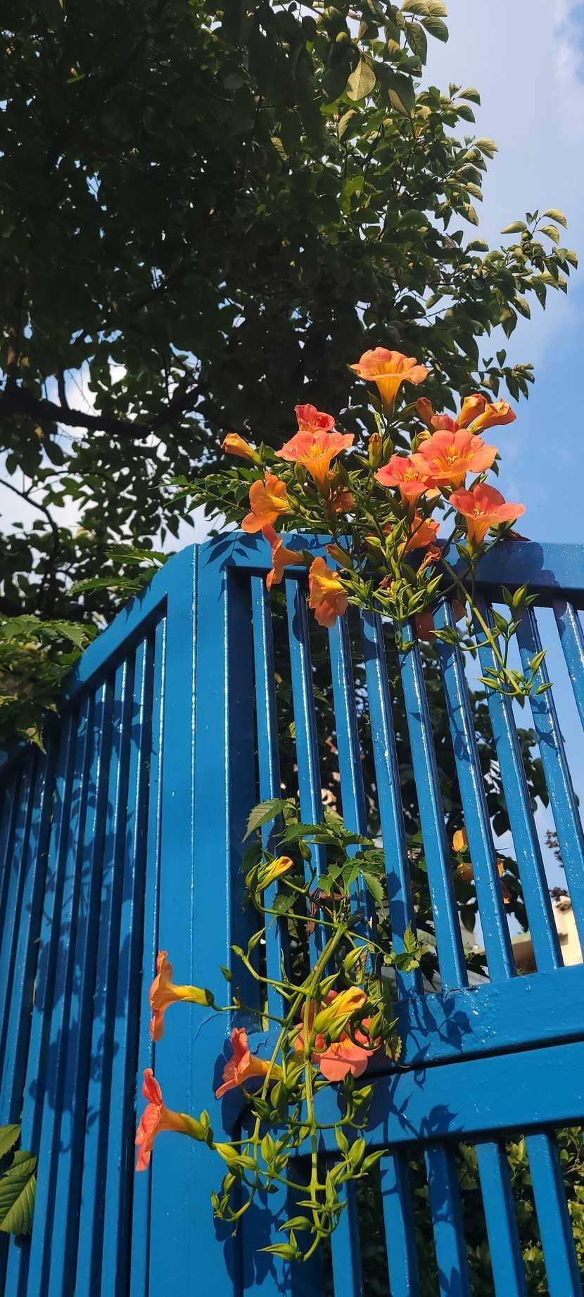 파란 대문을 장식한 능소화