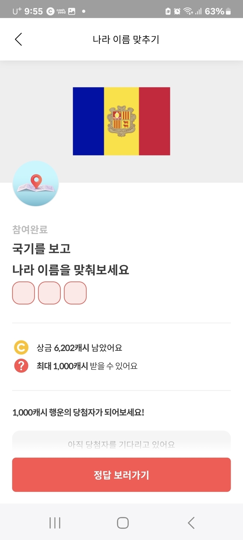 24.07.01 538 읽음 ●■ 나라 이름 맞추기는 안도라 ● 그대와 함께~ ☆ 구독하기 105 120 콘텐츠의 수익 36 ## 나라 이름 맞추기는?## 나라 이름 맞추기 정답은 안도라 120 0 / 300 입력