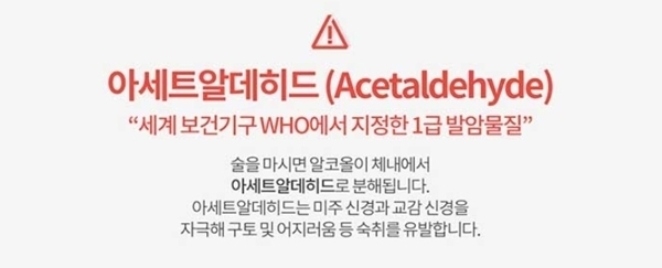 숙취의 핵심 원인은 바로 '아세트알데하이드'다. 술을 마시면 알코올 분해 효소에 의해 아세트알데하이드가 생성된다. 세계 보건기구 WHO에서 지정한 1급 발암물질인 '아세트알데하이드'가 몸에 존재하는 동안 우리는 두통, 메스꺼움, 피로, 안면 홍조, 가슴 두근거림, 전신 통증 등을 경험하게 된다.즉 아세트알데하이드를 줄이는 것이 '진정한 숙취 해소'다. 앞으로 숙취 해소제를 선택할 때는 이 부분을 꼭 기억하는 게 중요하다.