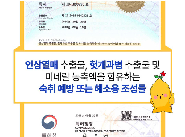 이다. 뛰어난 가성비와 효과로 소비자들 사이에서 큰 인기를 끌고 있다.1. 효과가 검증된 숙취해소제실제 인체적용시험을 통해 효과가 증명된 제품은 많지 않다. 반면 '술깨삼'은 인체적용실험 결과 숙취를 유발하는 주요 성분인 아세트알데하이드의 혈중 농도를 유의미하게 개선하는 것으로 나타났다. 알코올 분해효소인 ADH 활성을 증가시켰으며, 알데히드 분해효소인 ALDH 활성을 증가시켜 숙취 해소에 도움이 되는 결과를 보였다.헛개보다 숙취 해소에 효과가 좋은