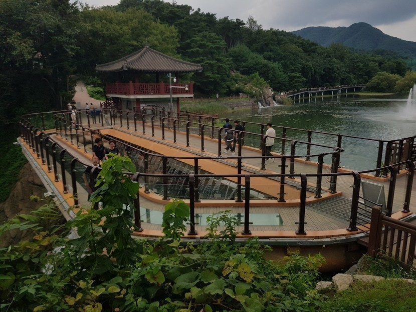 지난 금요일 제천 시장을 둘러보고.. 다음으로 향한 곳은 '의림지' 입니다.. 폭염 경보도 내렸는데.. 중간중간 내리는 비로 인해.. 땀을 한바가지 흘리며.. 열힘히 돌아 다녔네요~~ㅋㅋ제천 의림지는 삼한시대 축조된 저수지로.. 본래 임지라고 했다고 합니다.. 신라 진흥왕 때 악성, 우륵이 개울물을 막아.. 둑을 쌓았다는 이야기가 전해지고.. 그로부터 700년 뒤.. 이곳에 온 현감 박의림이 좀 더 견고하게 새로 쌓은 것이라고도 한다고.. 하네요..의림지를 둘러보다 보면.. 용추폭포 유리전망대가 나옵니다.. 용추폭포 위에 설치한 유리전망대는.. 인도교로 바닥 부분에 투명 유리와 불투명 유리가 섞여 있는데.. 철제 기둥에 설치된 센서를 지나면.. 불투명 유리가 투명 유리로 바뀌어 폭포가 내려다 보인다고 합니다.. 전 고소 공포증이 있는 관계로.. 그냥 멀리서 바라만 봤네요~~ㅋㅋ'용추폭포' 는 신월동에서 온 이무기가 용이되어 승천하지 못하고.. 이 곳에서 터져 죽었다는 전설에서 유래되었다고 전해 지는데요..