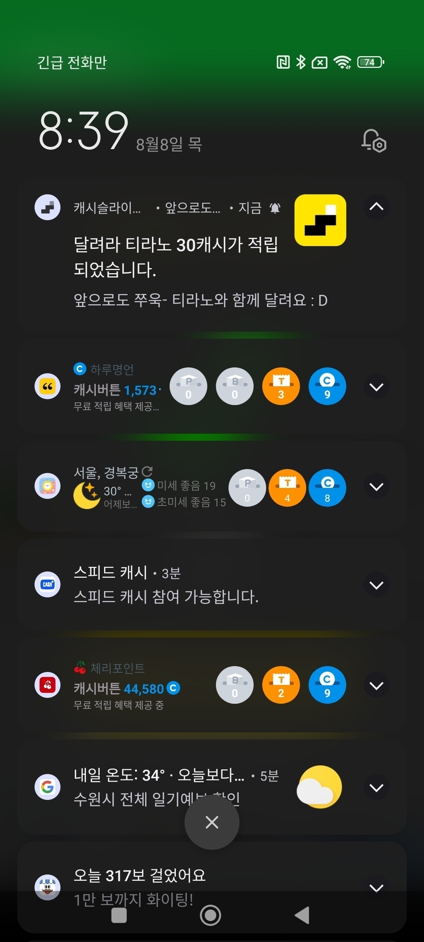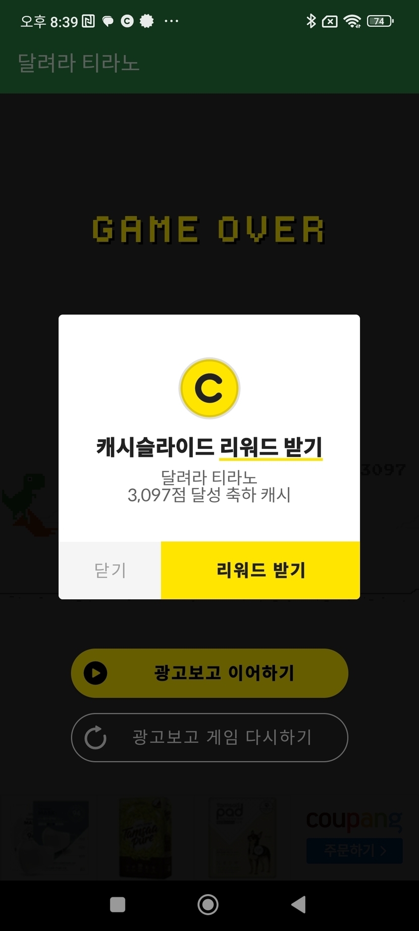 달려라 티라노 30캐시 적립 완료!