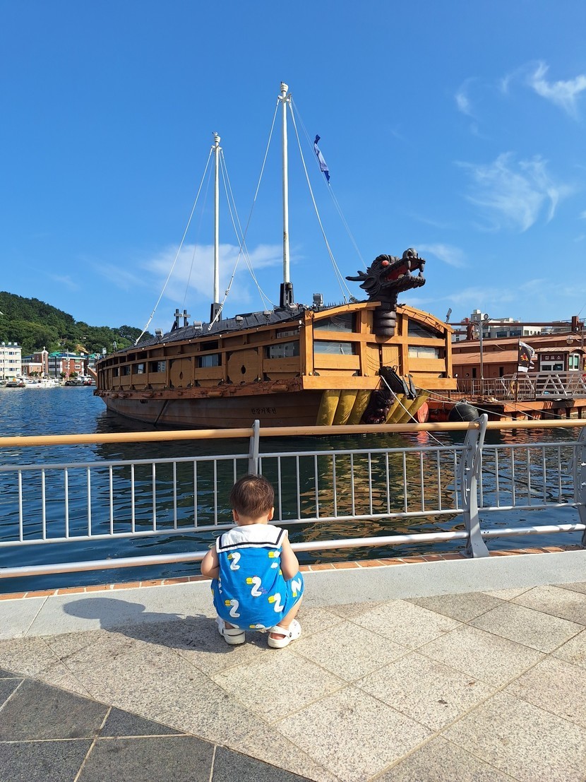 거북선앞에서 이쁘게 찍어주고 싶으나 절대 협조 안해주는 아드님