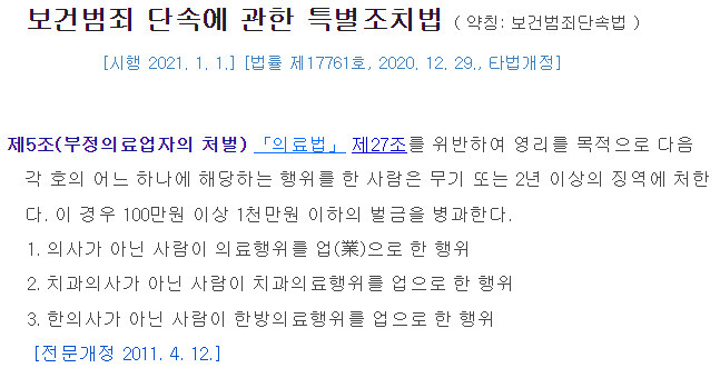 보건범죄단속에관한특별조치법...최소 2년이상 징역, 무기징역 처벌 가능 '보건범죄단속에관한특별조치법'에 따르면, 의사가 아닌 다른 사람이 수술과 같은 의료행위를 하는 경우 처벌은 제5조(부정의료업자의 처벌)에 따라, 「의료법」 제27조를 위반하여 영리를 목적으로 의사가 아닌 사람이 의료행위를 업으로 한 경우, 이는 무기 또는 2년 이상의 징역에 처해질 수 있다. 또한, 이 경우 100만원 이상 1천만원 이하의 벌금도 병과(倂科)될 수 있다. 따라서, 의사가 아닌 다른 사람이 수술을 하는 것은 엄격히 금지되어 있으며, 이러한 행위가 적발될 경우 무기징역이나 최소 2년 이상의 징역형과 함께 벌금형이 추가로 부과될 수 있다.
