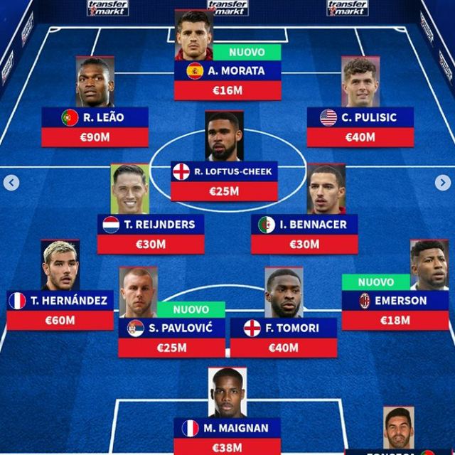 유럽축구 이적전문매체 트랜스퍼마크트는 올 여름 이적시장 다양한 선수를 영입한 AC밀란의 베스트11을 예측해 소개했다. AC밀란의 예상 베스트11 공격진에는 레앙, 모라타, 풀리시치가 이름을 올렸고 중원은 로프터스-치크, 라인더르스, 베나체르가 구축했다. 수비진에는 에르난데스, 파블로비치, 토모리, 에메르송이 포진했고 골키퍼에는 마이그난이 이름을 올렸다.