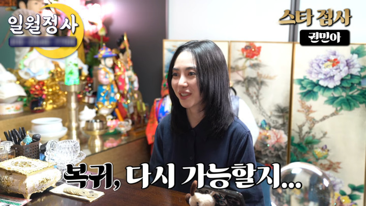먼저 권민아는 연예계 복귀 가능성을 물어봤다. 그는 "연예인이라는 직업을 참 좋아했었다. 지금도 잘 맞는다고 생각하고 저랑 잘 맞는다고 생각했다. 이제 사실상 복귀가 안 되겠다는 생각은 많이 갖고 있는데 다시 가능할지 듣고 싶었다"고 말했고, 이에 일월정사는 "가능하다"고 답했다.