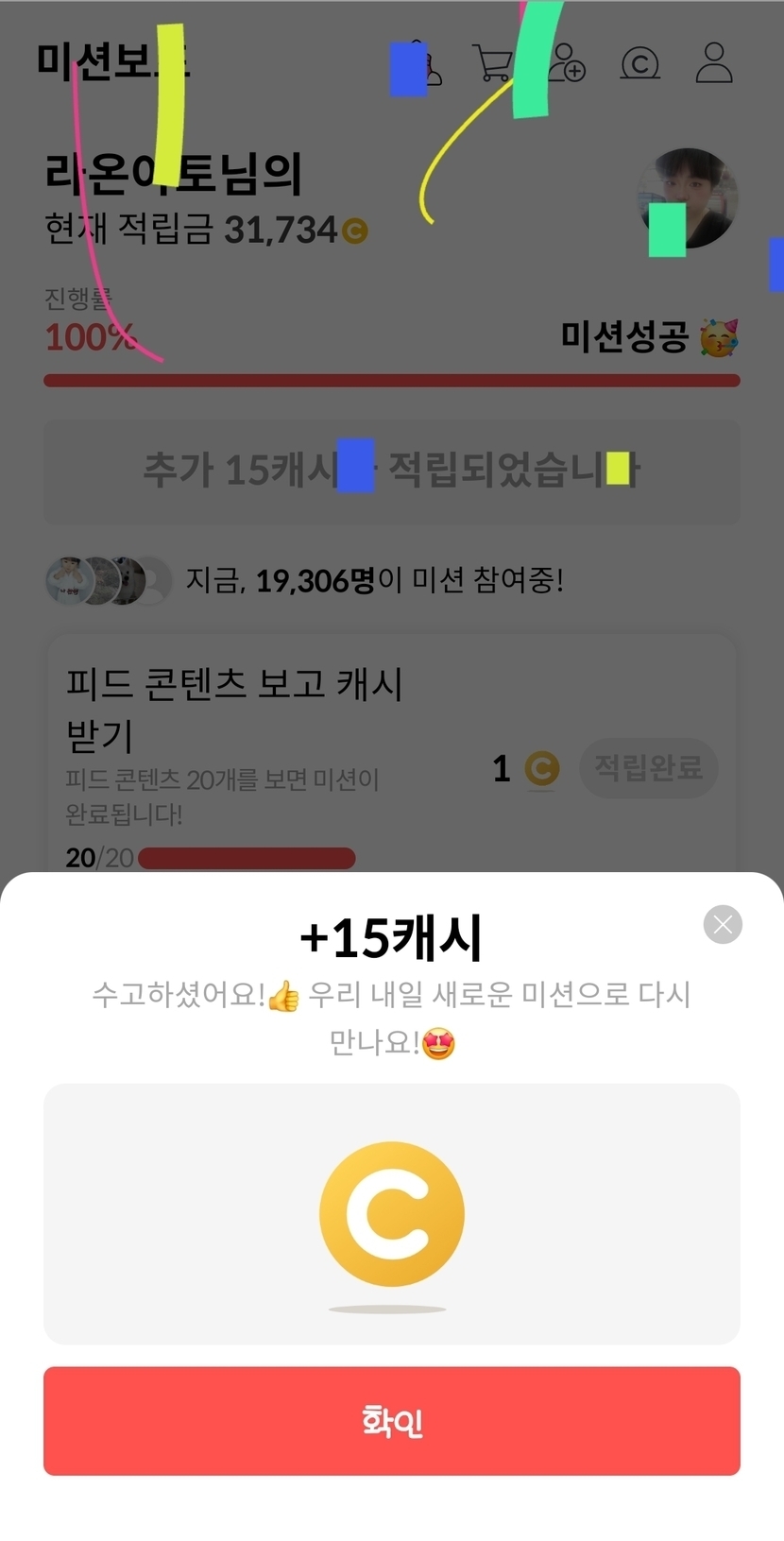 오늘의 미션 클리어로 15캐시 받았어요~ㅎ