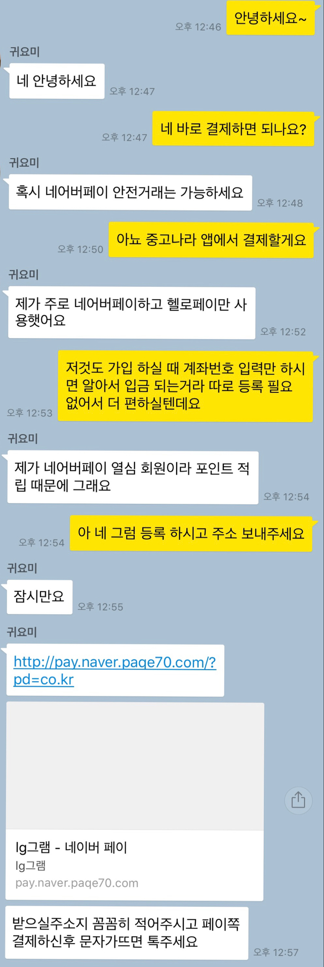 이 때 부터 눈치를 챘지만 속는셈 치고 네이버 페이를 알려 달라고 했습니다,,
